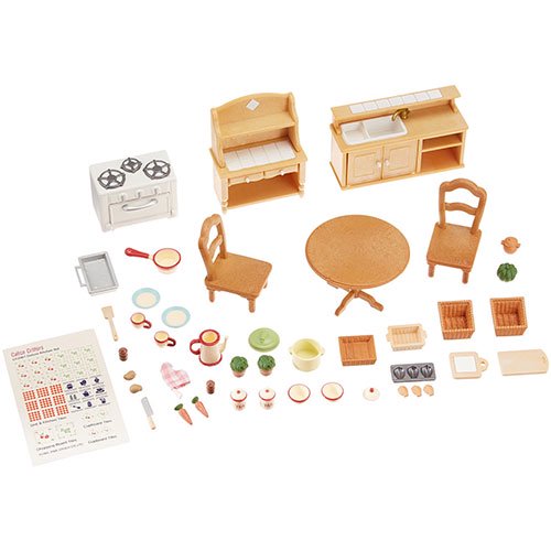 Add to registry add to favorites. Calico critters kitchen island dollhouse furniture set. Includes over 18 pieces of furniture and accessories for dollhouse role play including island furniture, mixer, scale, doughnut and waffle maker, ladle, milk and more! New calico critters room set japan gift japan import from japan. 5.88 inches (h) x 2.38 inches (w) x 11.75 inches (l). Calico critters cc2257 deluxe kozy kitchen set. Kitchen play set (includes 37 pieces). Kitchen play set features cooking utensils that can be stored in the kitchen cabinet and drawers. This set comes with a large hutch, sink, stove/oven, cookware, refrigerator/freezer, food & many accessories. Calico critters kitchen play set is an essential furniture set for any calico critters dollhouse. Countertop with sink, refrigerator, hutch, round table, oven, cutting board, lettuce, carrot, 2 tomatoes, 2 cucumbers, 2 mushrooms, bread knife, ice. Calico critters hopper kangaroo family. The refrigerator contains a freezer compartment, from which ice can be taken out using the provided scoop.